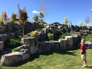 And the parks department has also successfully revitalized some more areas of the greenbelt around the river. One sunny day, the kids and I took their scooters down to the new, improved path and had several breaks to enjoy the fun rock walls and plantings. There are so many different kinds of plants and flowers among the rocks; it really is pretty scenery and hard to do justice in these photos.